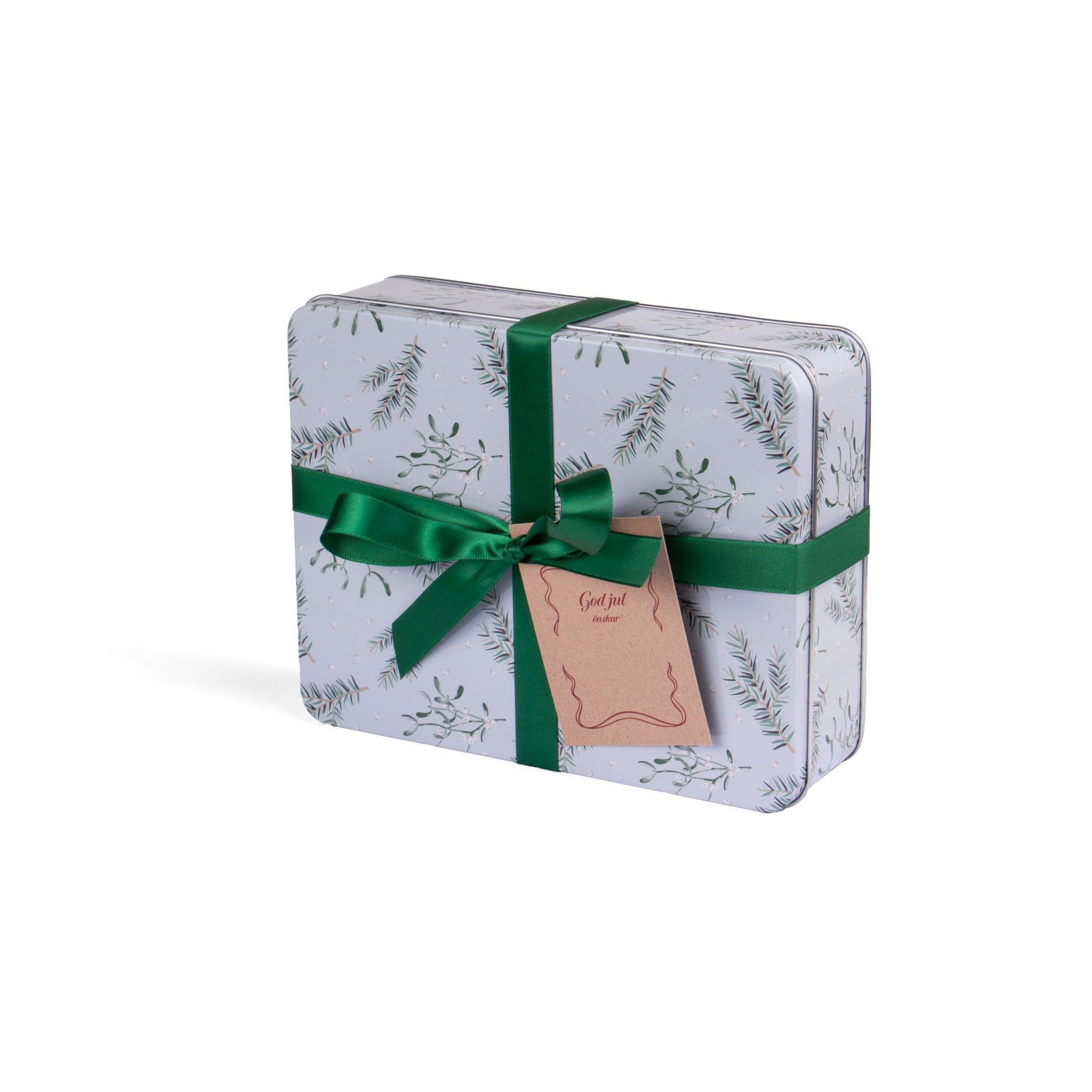 Plåtburk prydd med ett stilrent vintermotiv. Försluts med ett grönt sidenband för att höja lyxkänslan. Lägg till ett julkort tryckt på kraftpapper och din julgåva är fulländad.