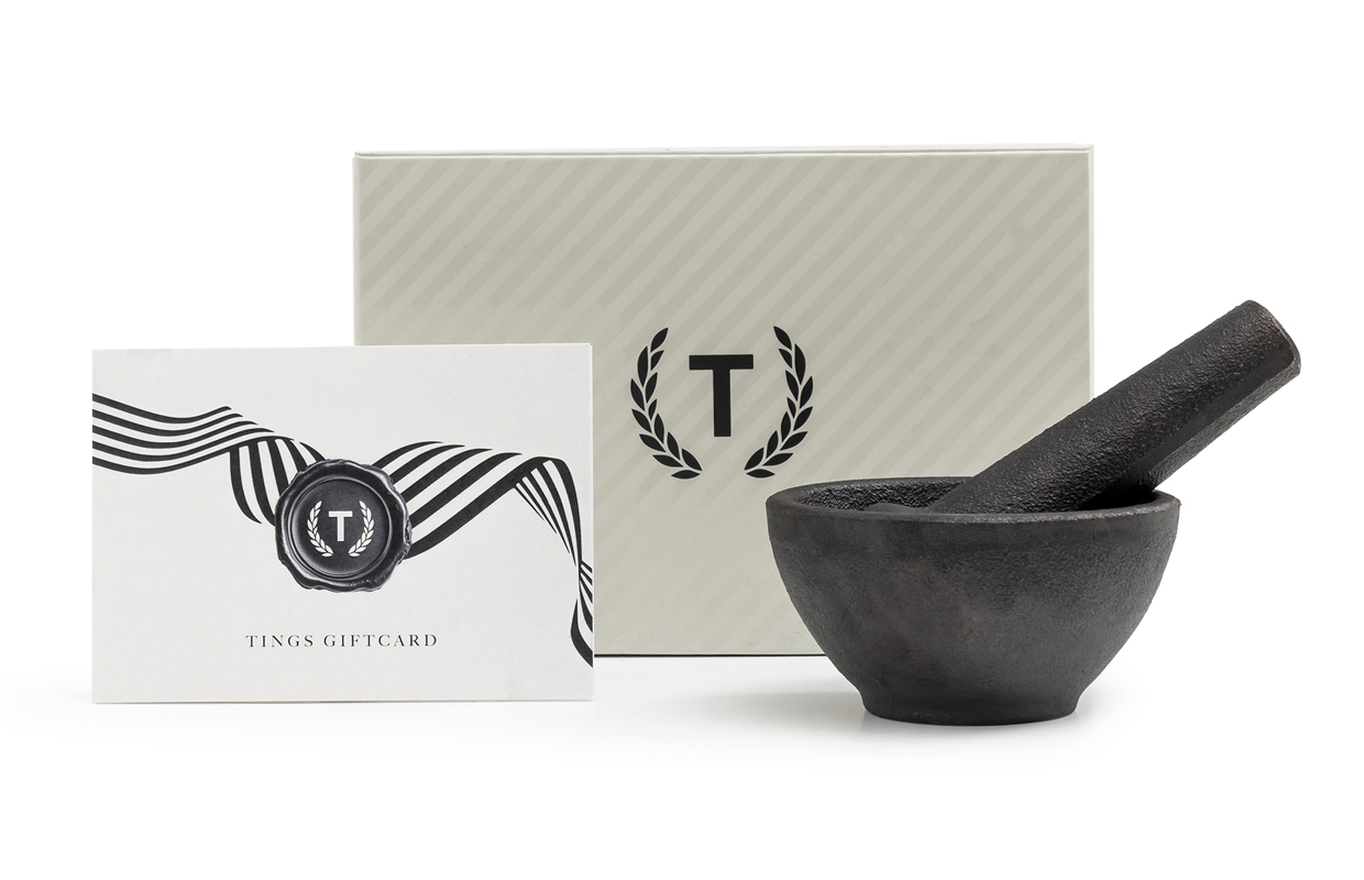 Tings Giftcard med en mortel i gjutjärn som premie/extragåva. Morteln är 8,5cm i diameter och 4,5cm hög. Morteln kommer förpackad tillsammans med julkort ( Välj mellan fyra olika motiv) och giftcard i en elegant box.