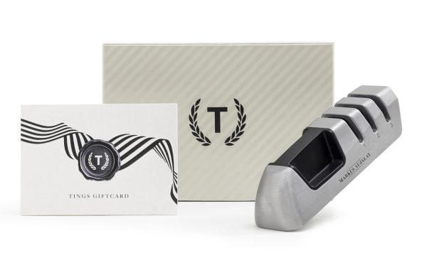 Tings Giftcard med en knivslip som premie/extragåva. Knivslipen är 12cm lång och 3,5cm hög och försedd med tre slipfunktioner. Knivslipen kommer förpackad tillsammans med julkort ( Välj mellan fyra motiv) och giftcard i en elegant box.